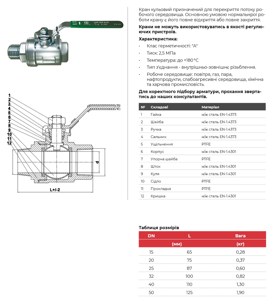 Кран кульовий двоскладовий муфтовий нержавіючий ВЗР, куля-нж сталь 304, PTFE, PN25
