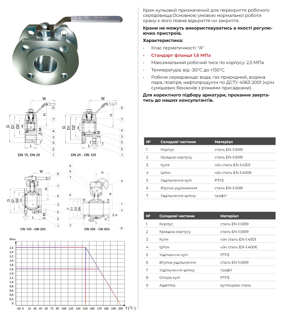 Кран кульовий фланцевий сталевий, куля-нж сталь 304, PTFE, PN25