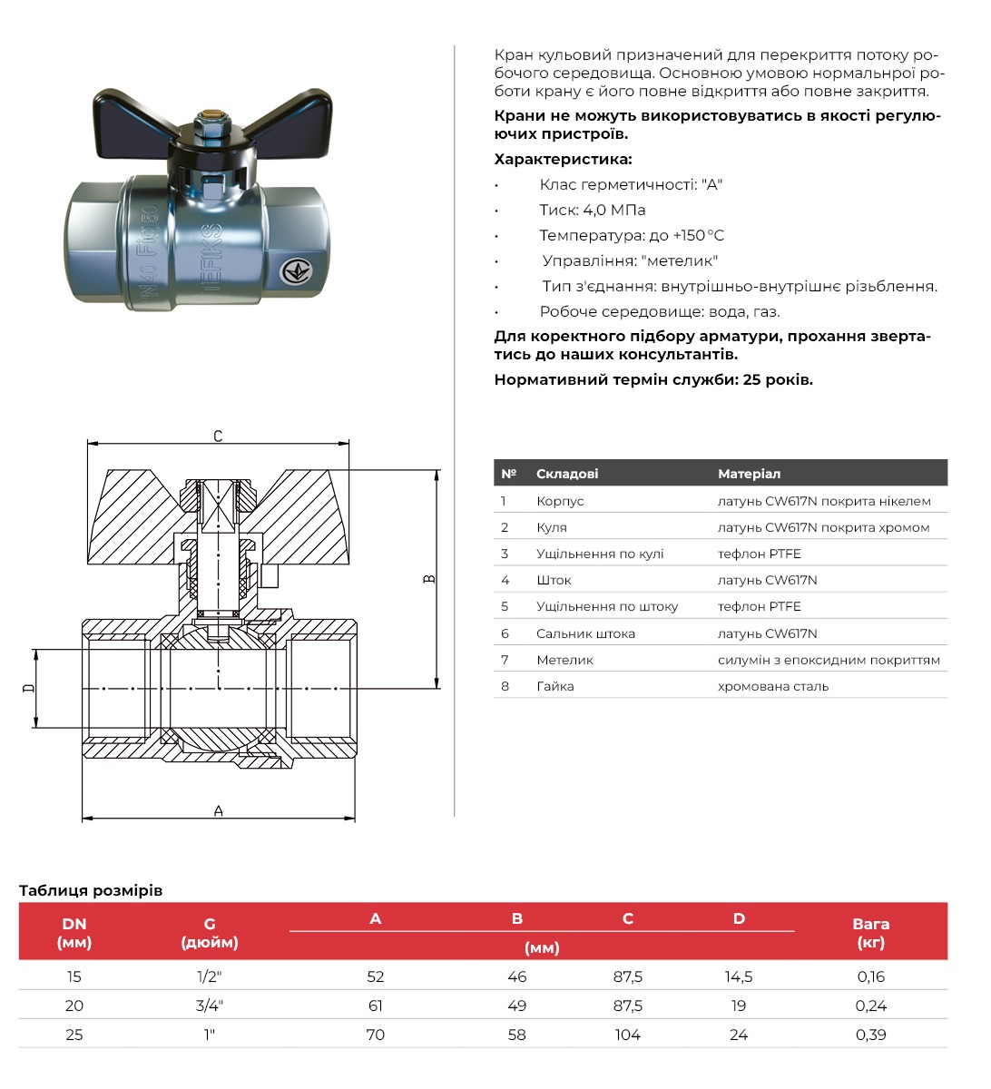 Кран кульовий муфтовий латунний, PN40, вода, газ