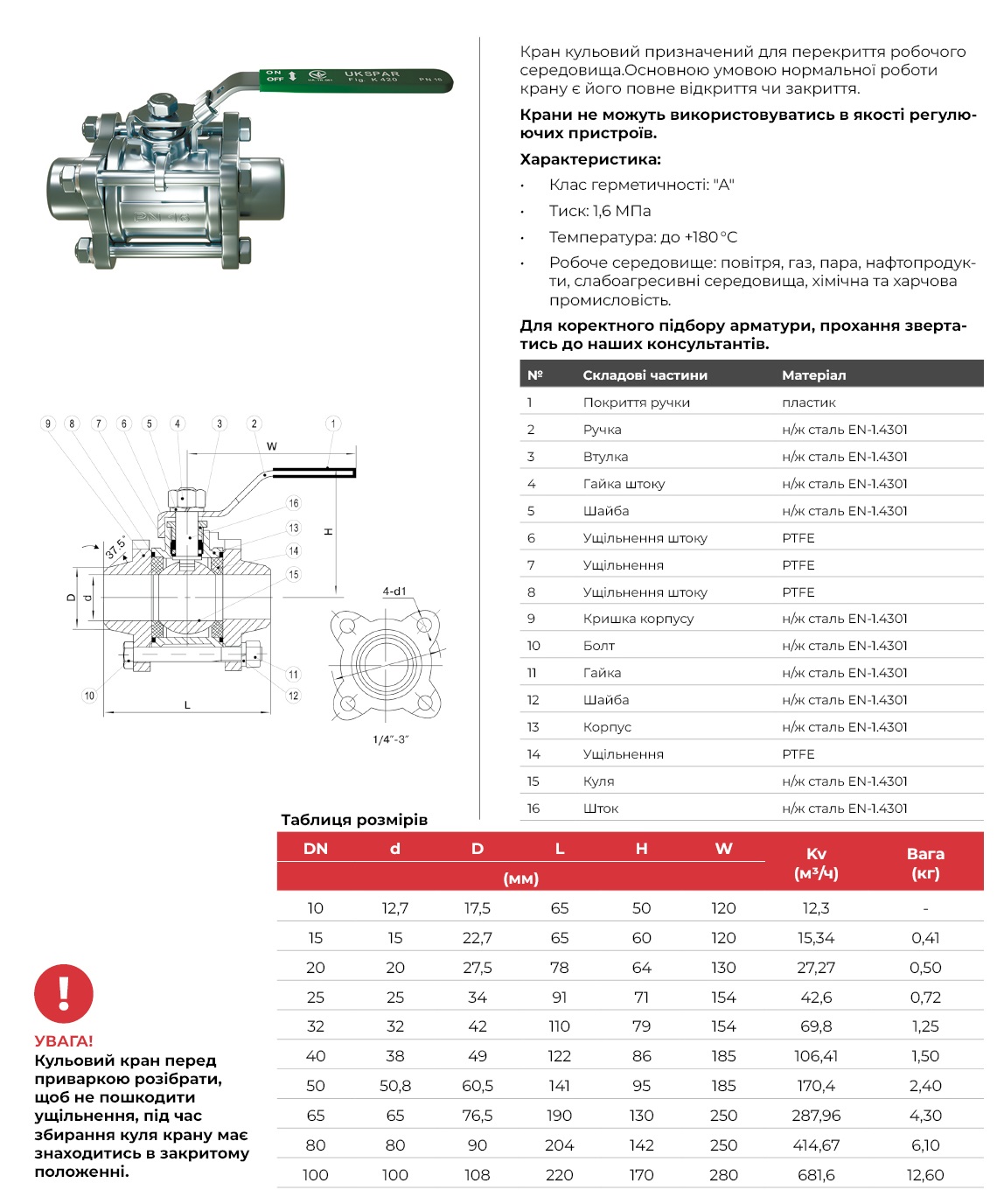 Кран кульовий трискладовий приварний нержавіючий, куля-нж сталь 304, PTFE, PN16