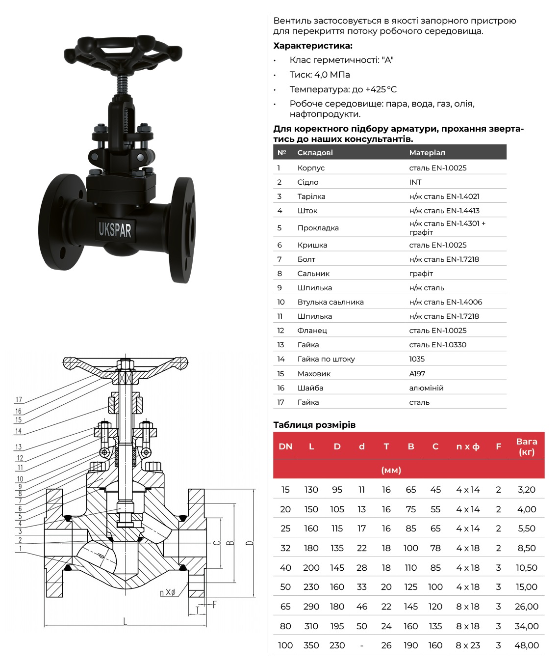 Вентиль запірний фланцевий сталевий, тарілка-нж сталь, PN40