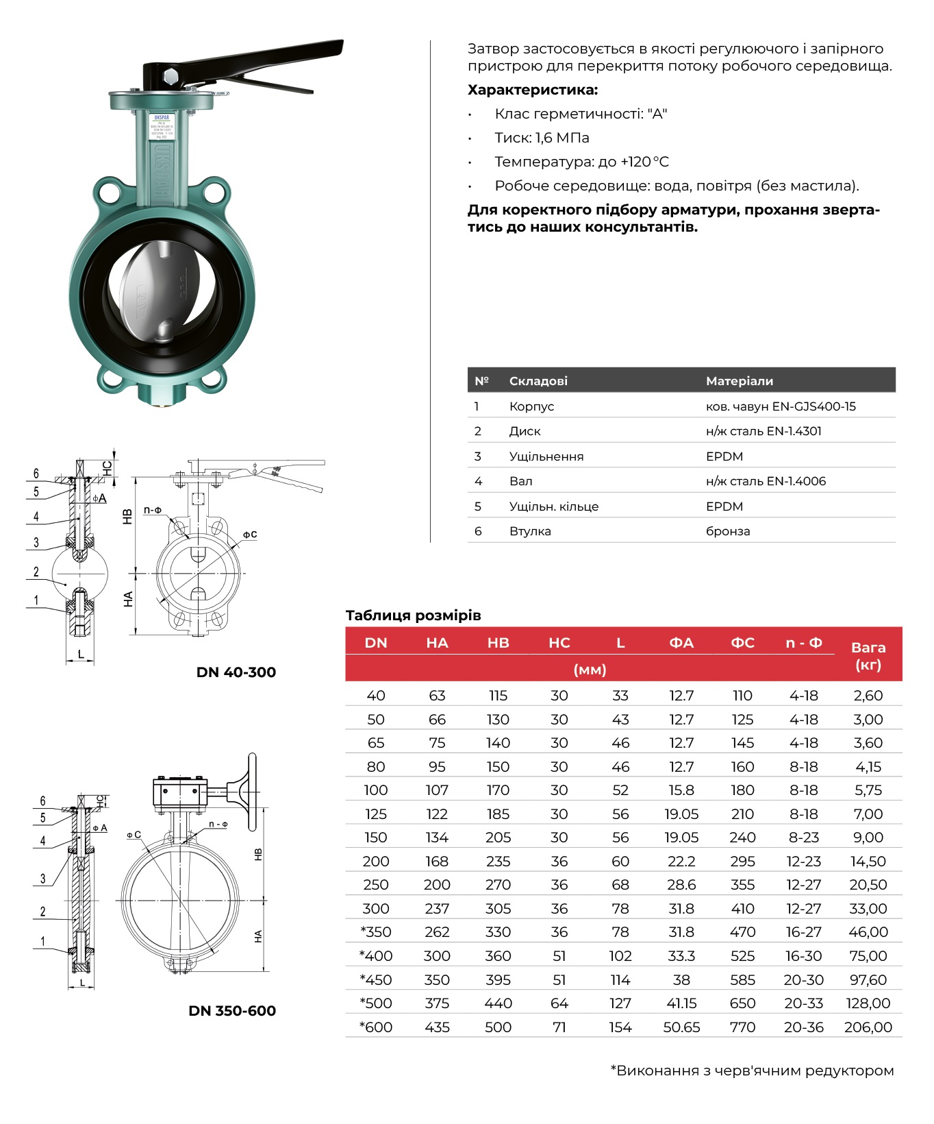 Затвор поворотний міжфланцевий чавунний, диск-нж сталь 304, EPDM, PN16