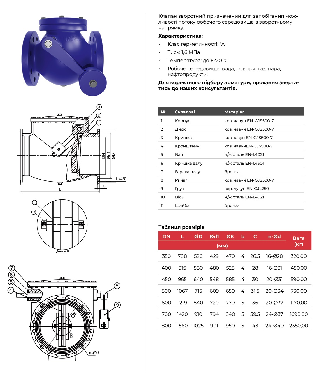 Зворотний клапан поворотний з противагою фланцевий чавунний, диск-чавун GGG50, PN16